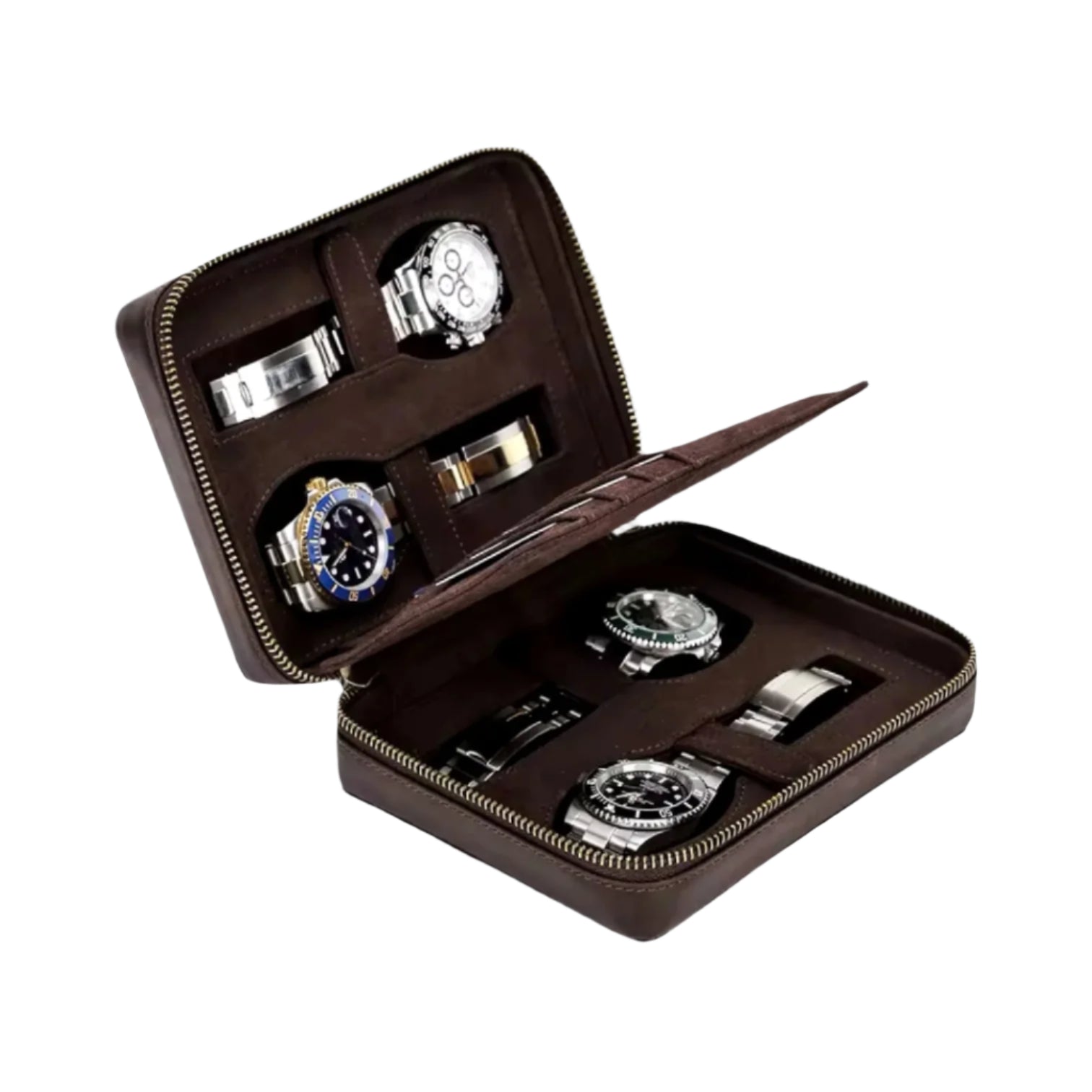 Forget about carrying a bulky case through airport security control. This travel case for 4 watches is the perfect solution for watch enthusiasts who want to protect their pieces while traveling. Made from high-quality “Crazy Horse” leather, it combines an elegant and durable finish with a soft touch and natural ventilation to care for your watches. Its individually lined compartments protect the watch faces and straps, while the zip closure ensures stability during transport. A functional accessory with classic style, perfect for carrying your watches securely and elegantly.